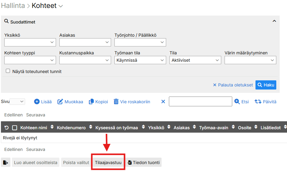 Vastuu Groupin rajapintatunnisteen saat lisättyä web-järjestelmän sivulla Hallinta > Kohteet > Tilaajavastuu. Tilaajavastuun löydät sivun alaosasta: