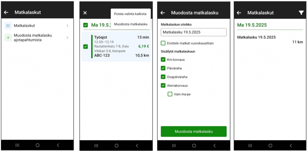 Uuden päivityksen myötä käyttäjät voivat luoda matkalaskuja entistä vaivattomammin suoraan mobiilisovelluksessa valitsemalla ajotapahtumat ja muodostamalla matkalaskun helposti yhdellä kertaa.