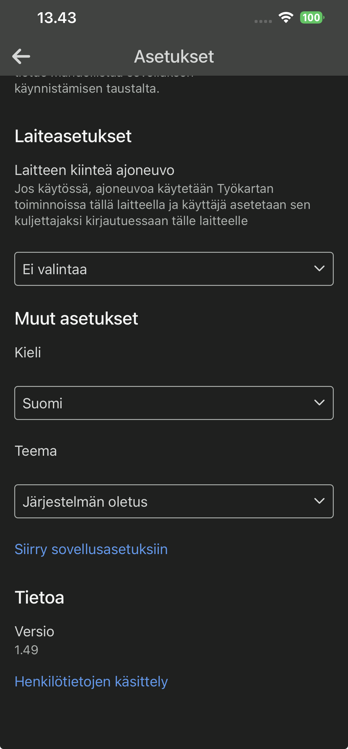 - Sovellukseen on lisätty tuki vaalealle ja tummalle teemalle. Käyttäjä voi valita haluamansa teeman sovelluksen asetuksista tai asettaa sovelluksen noudattamaan puhelimen järjestelmäasetusta. Tämä parantaa sovelluksen käytettävyyttä eri valaistusolosuhteissa ja säästää laitteen akkua tummaa tilaa käytettäessä. Teeman saa määritettyä Asetukset-valikossa.